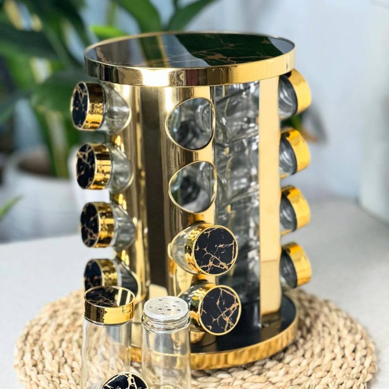اگر به دنبال نظمدهی به آشپزخانه خود با یک وسیله شیک، کاربردی و مدرن هستید، جاادویه چرخشی طلایی ماربل ۱۶تایی انتخابی ایدهآل برای شماست. این جاادویه وارداتی با طراحی خاص و ترکیب رنگ مشکی و طلایی، جلوهای لوکس به فضای آشپزخانهتان میبخشد و همزمان دسترسی آسان به انواع ادویهها را فراهم میکند.